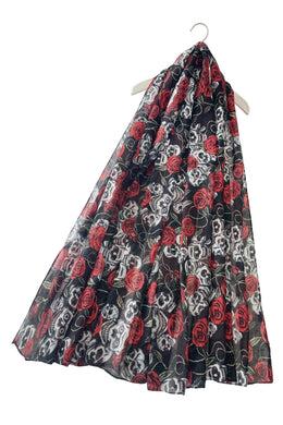 Cute Skull & Rose Print Frayed Scarf - BLACK